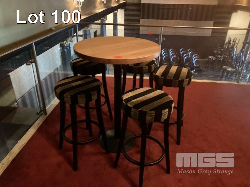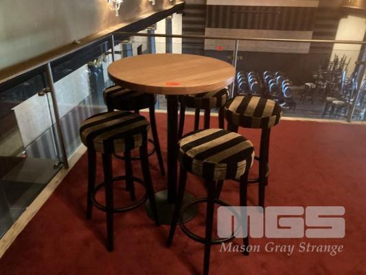 DRY BAR, 80cm DIAMETER, SOLID TIMBER TOP & 5 x STOOLS, STRIPED FABRIC, TIMBER FRAME
