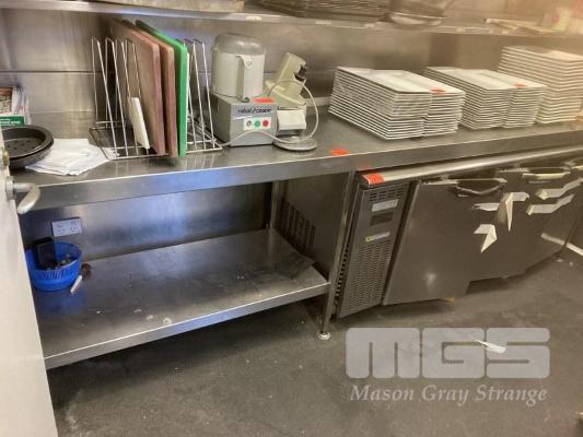 STAINLESS STEEL PREP BENCH, 330 x 70cm WITH HALF SHELF & SPLASHBACK