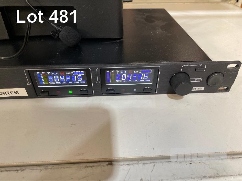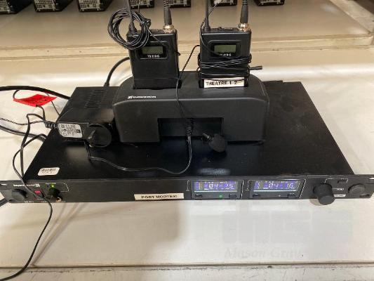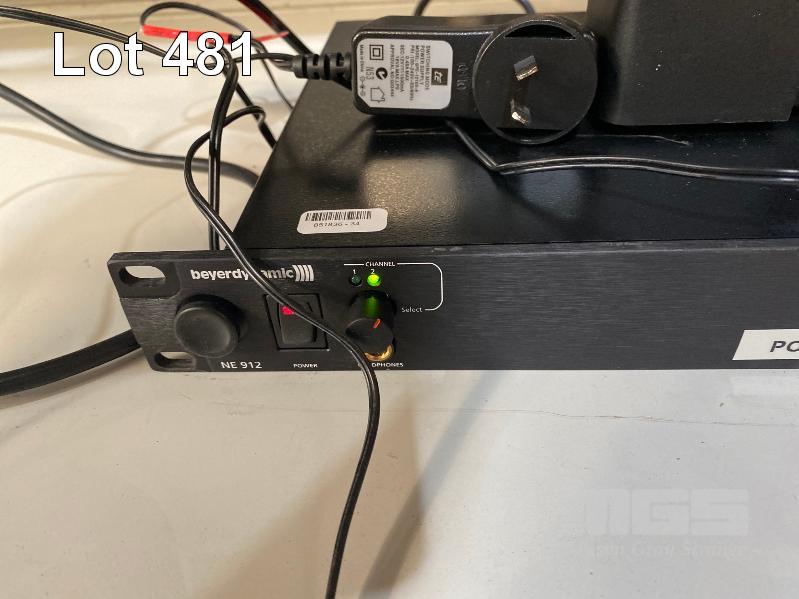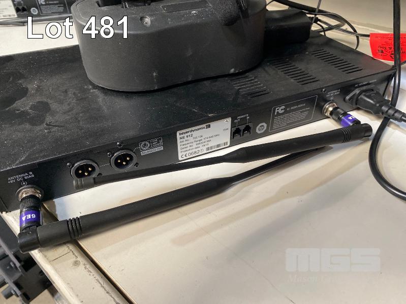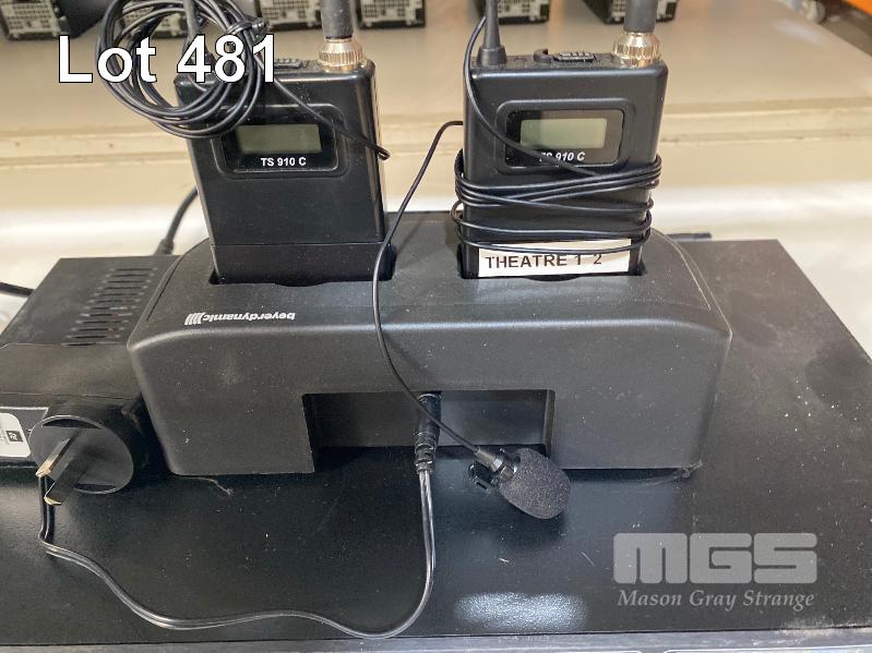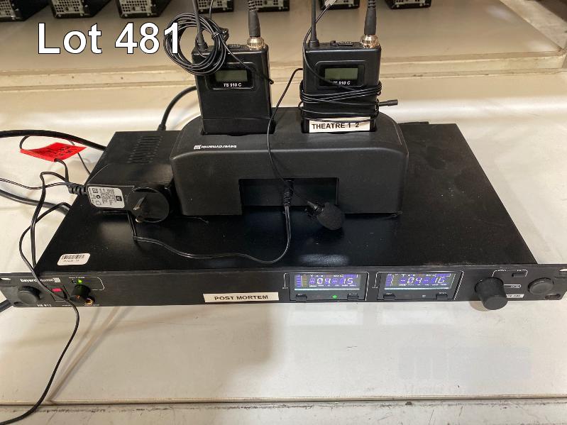 BEYERDYNAMIC NE 912 2-CHANNEL WIRELESS AUDIO RECEIVER (574-646MHz) WITH 2 x TS910C BELTPACK TRANSMITTERS & LAPEL MICROPHONES WITH CHARGING DOCK S/N:868304738A