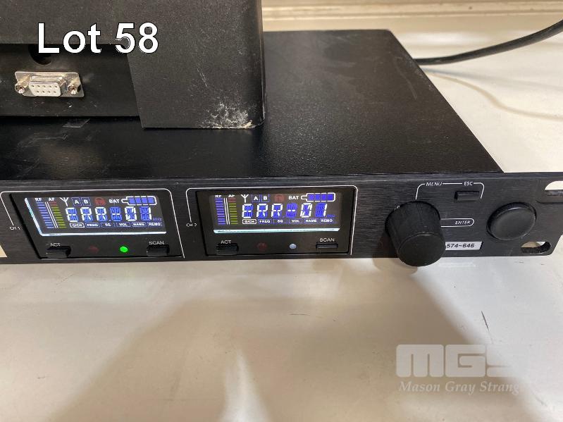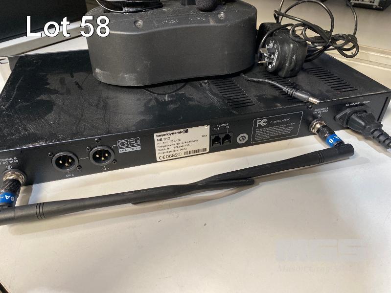 BEYERDYNAMIC NE 912 2-CHANNEL WIRELESS AUDIO RECEIVER (574-646MHz) WITH 2 x TS910C BELTPACK TRANSMITTERS & LAPEL MICROPHONES WITH CHARGING DOCK (NOTE: DISPLAY SHOWING "ERR-01") S/N:868304745A