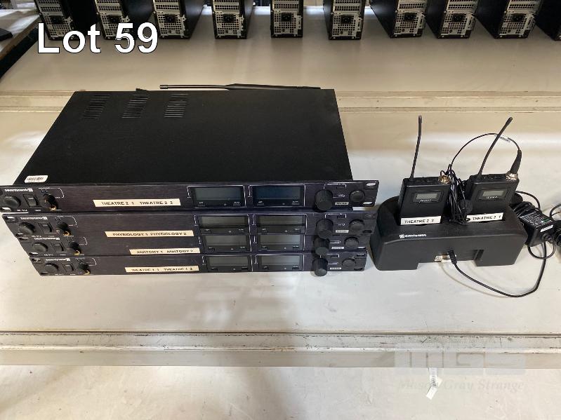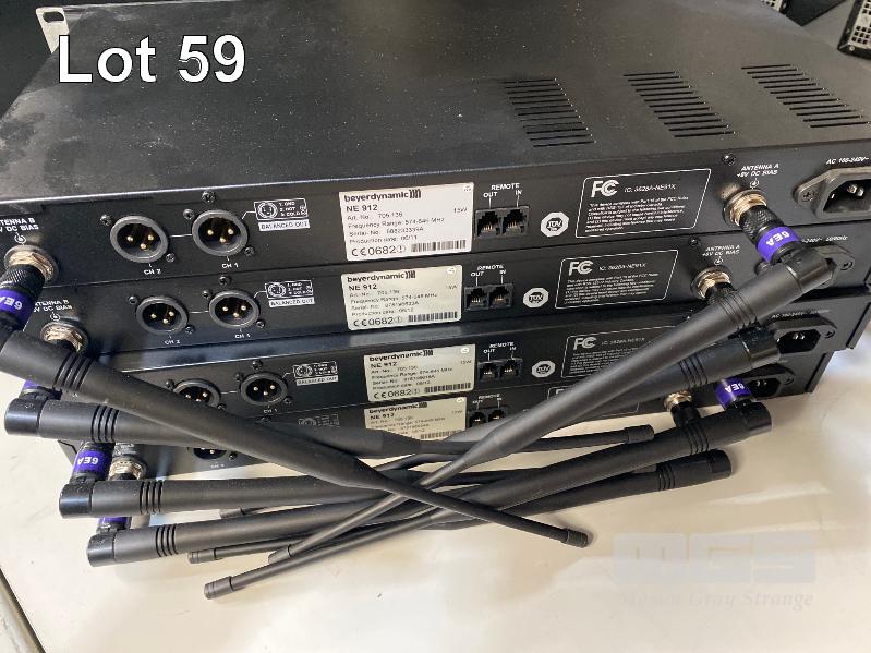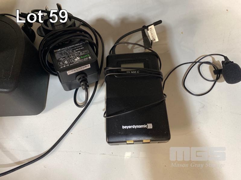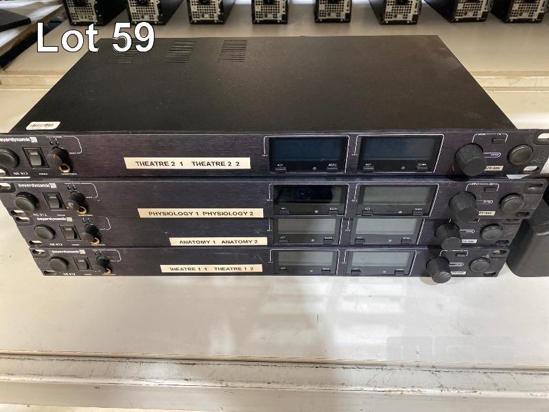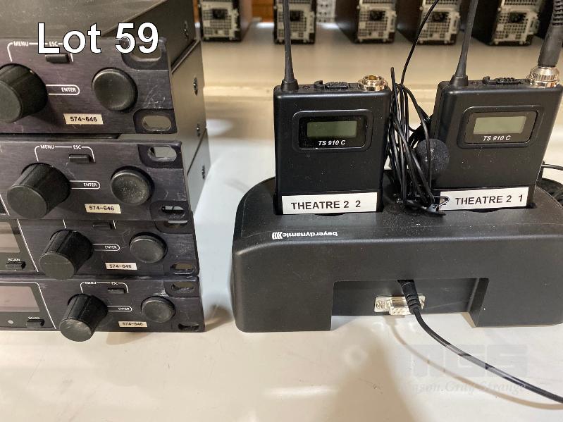 4 x BEYERDYNAMIC NE 912 2-CHANNEL WIRELESS AUDIO RECEIVER (574-646MHz) WITH 2 x TS910C BELTPACK TRANSMITTERS & LAPEL MICROPHONES WITH CHARGING DOCK, 1 x TS900C BELTPACK TRANSMITTER & LAPEL MICROPHONE (NOTE: ALL FAULTY, NOT POWERING ON)