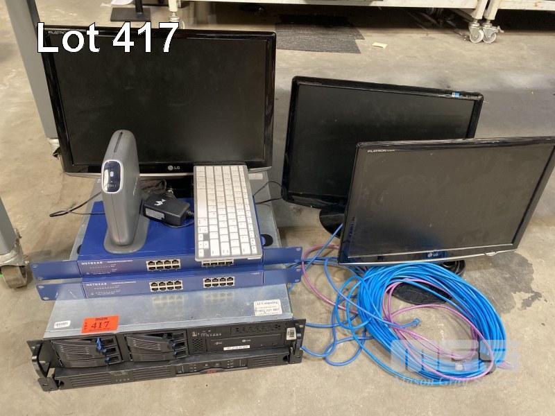 RACKMOUNT PC, CORE 2 DUO E7500 @ 2.93GHz, 8GB RAM, 320GB HDD, 2 x NETGEAR SWITCHES, 3 x MONITORS, BELKIN ROUTER, APC UPS, NETWORK CABLE ETC