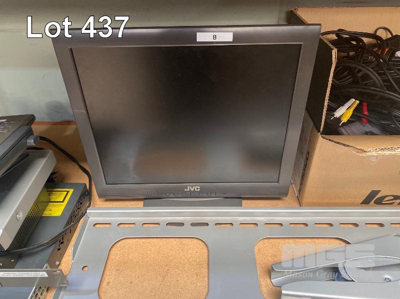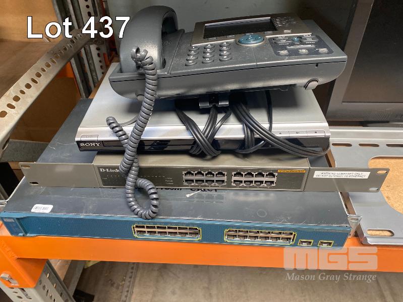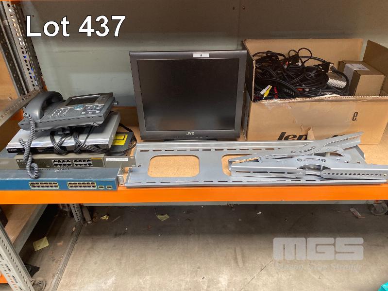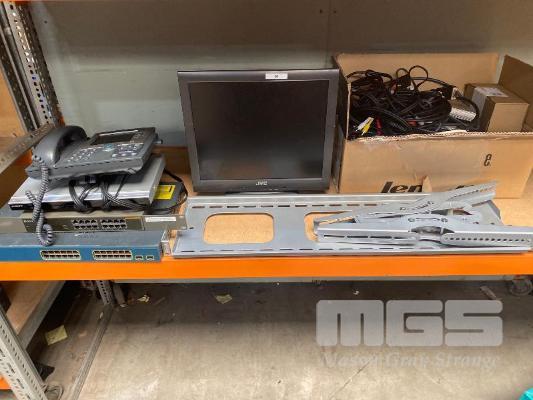 CISCO CATALYST 3560 SERIES 24-PORT SWITCH, D-LINK 16-PORT SWITCH, CISCO IP PHONE, JVC 15" MONITOR, TV WALL MOUNT BRACKET, BOX OF ASST CABLES