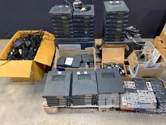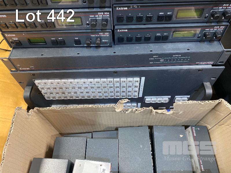 PALLET LOT EXTRON AUDIO EQUIPMENT INCLUDING 2 x EXTRON CROSSPOINT 450 PLUS SERIES SWITCHERS, 34 x EXTRON DVS304 VIDEO SCALERS, 1 x VSC 500 VIDEO SCAN CONVERTER, 1 x EXTRON XTP R HDMI TRANSMITTER, 2 x BOXES OF EXTRON MTP T 15HD RS & MTP RL 15HD RS TRANSMITTER/RECEIVERS, 1 x BOX OF EXTRON VTR001 ADAPTERS, 2 x WALL PLATES, 1 x BOX EXTRON POWER SUPPLIES, (NO CABLES)