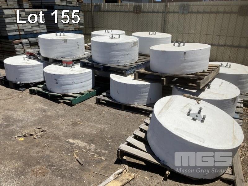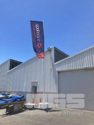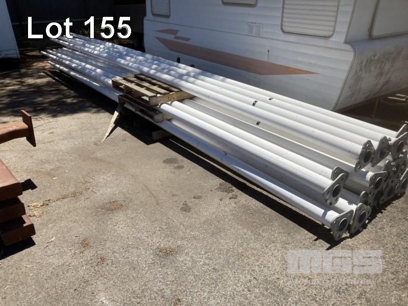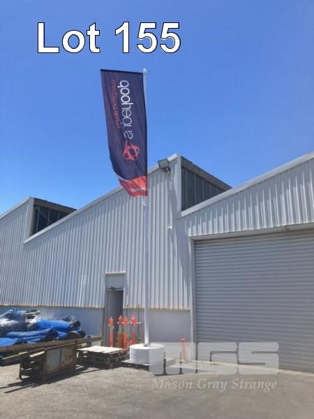 2 x RELOCATABLE FLAG POLES, FORMENTA, 8.9m FIBREGLASS CONSTRUCTION, TILTING HINGE BASE (NO PINS) MOUNTED ON CONCRETE BLOCK (DISMANTLED)