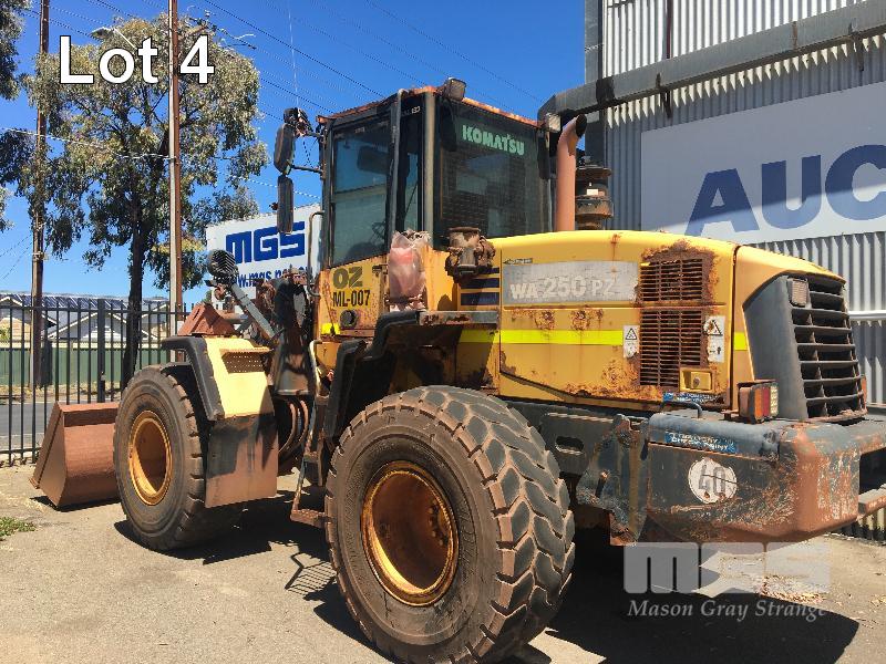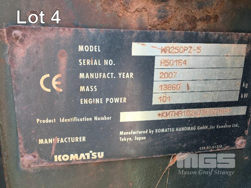 2007 KOMATSU WA250PZ-5 GALEO FRONT END LOADER PIN: KMTWA102K79H50164 HOURS: NOT SHOWING 6 CYLINDER TURBO, DIESEL, S/NO: H50164 MASS: 13,860kg ENGINE POWER: 101kw FITTED WITH GP BUCKET, 2550mm, ROPS & FOPS CABIN 2 WAY RADIOS, LOADRITE FORCE WEIGHT SCALES FIRE SYSTEM, LED SPOT LIGHTS RUNS & DRIVES BUT WONT START ON KEY, NEED TO JUMP STARTER MOTOR, LOTS OF RUST IN CABIN