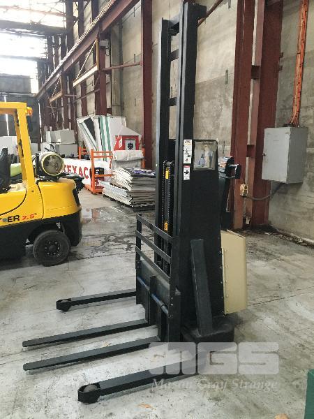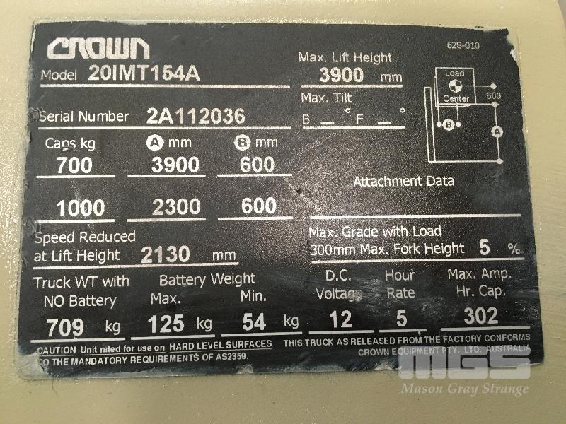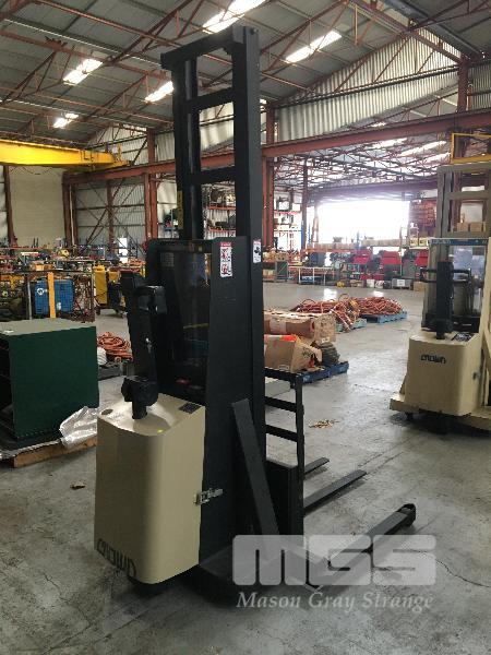 WALKIE STACKER, CROWN MOD: 201MT154A S/NO: 2A112036 LIFT CAP: 1,000kg MAX LIFT HEIGHT: 3,900mm WIDTH ADJUSTABLE COUNTER BALANCE LEGS BUILT IN CHARGER, 240V