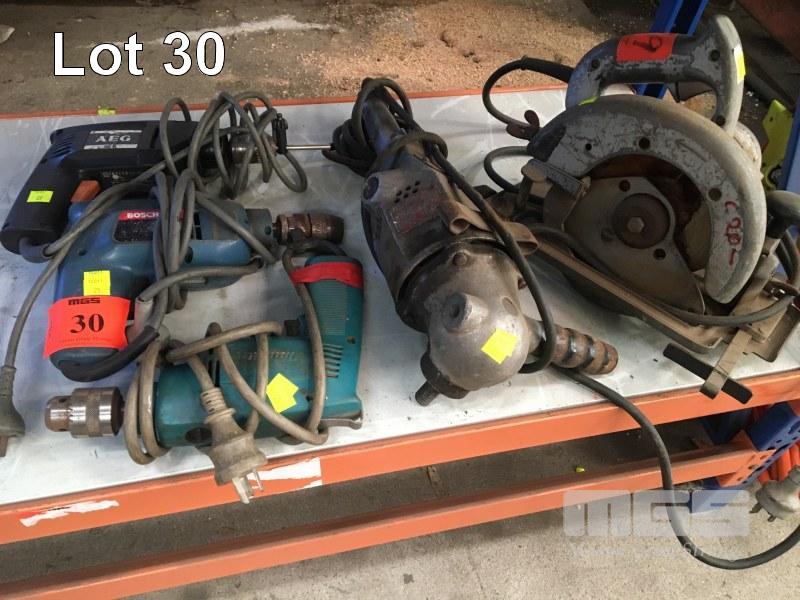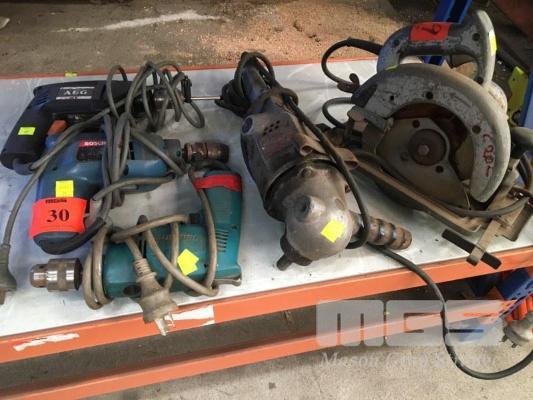 3 x ASSORTED DRILLS, 13mm, 1 x ANGLE DRIVER & B&D CIRCULAR SAW, 240V