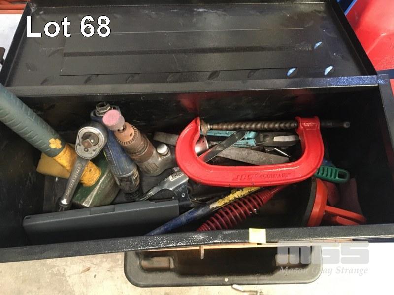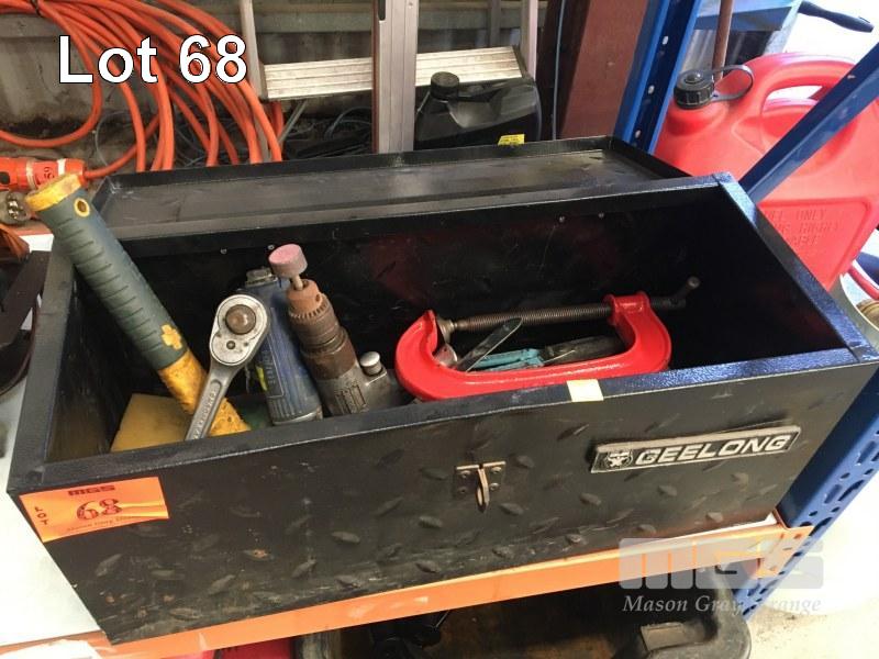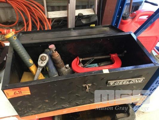 GEELONG TOOL BOX, STEEL & QUANTITY ASSORTED HAND TOOLS, & PNEUMATIC GRINDER & DRILL