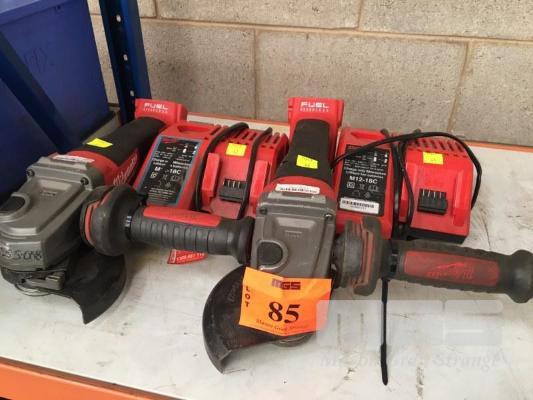 2 x MILWAUKEE ANGLE GRINDERS, M18, CAG125XPD WITH HANDLE & CHARGERS, NO BATTERY