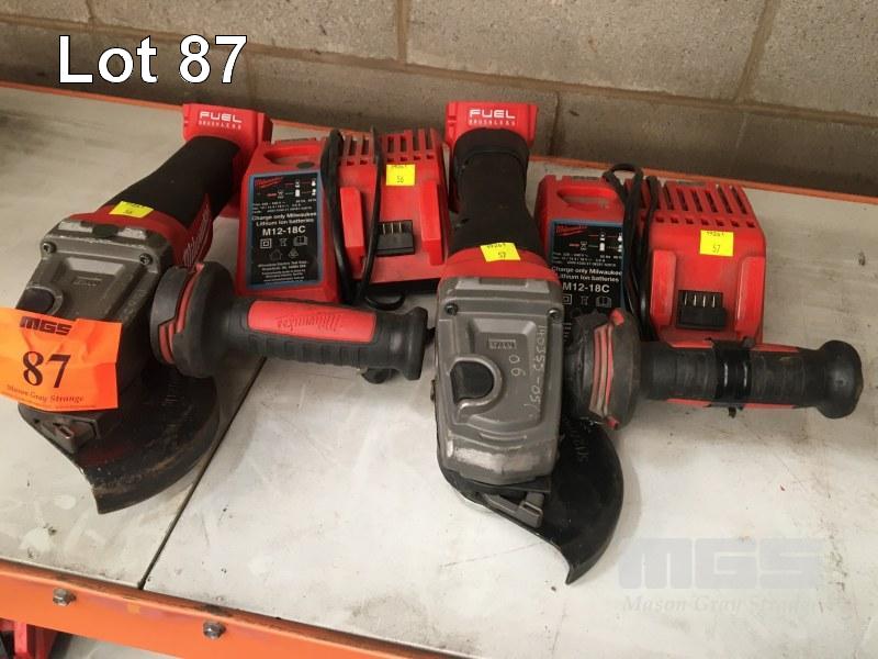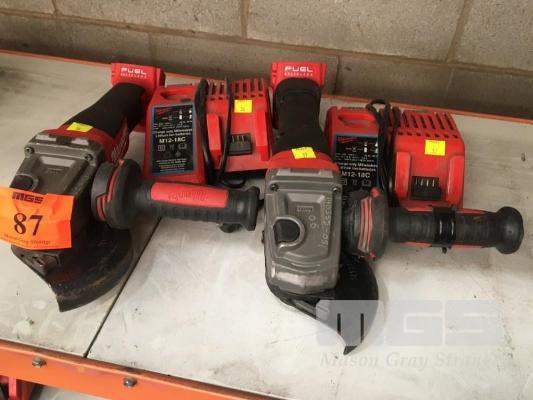 2 x MILWAUKEE ANGLE GRINDERS, M18, CAG125XPD WITH HANDLE & CHARGERS, NO BATTERIES