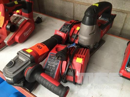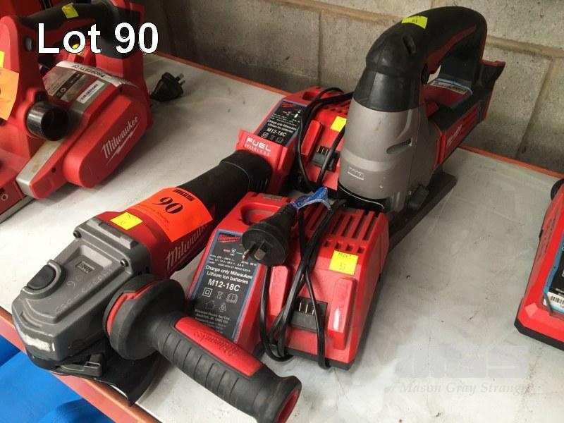 MILWAUKEE ANGLE GRINDER, M18, CAG125XPD WITH HANDLE & CHARGER, NO BATTERY & MILWAUKEE JIGSAW, HD18JS WITH CHARGER, NO BATTERY
