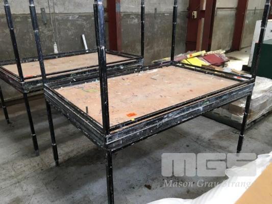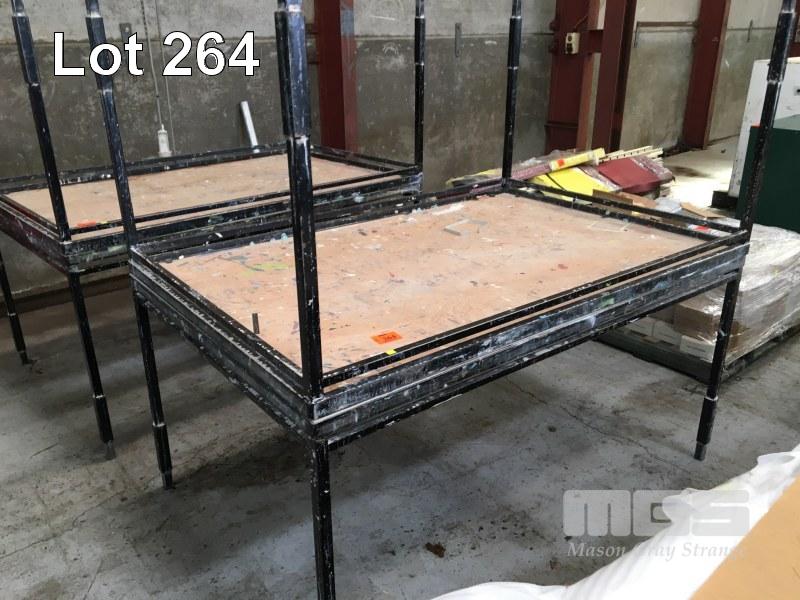 2 x WORK BENCHES, 180 x 120cm, TIMBER TOP, STEEL FRAME