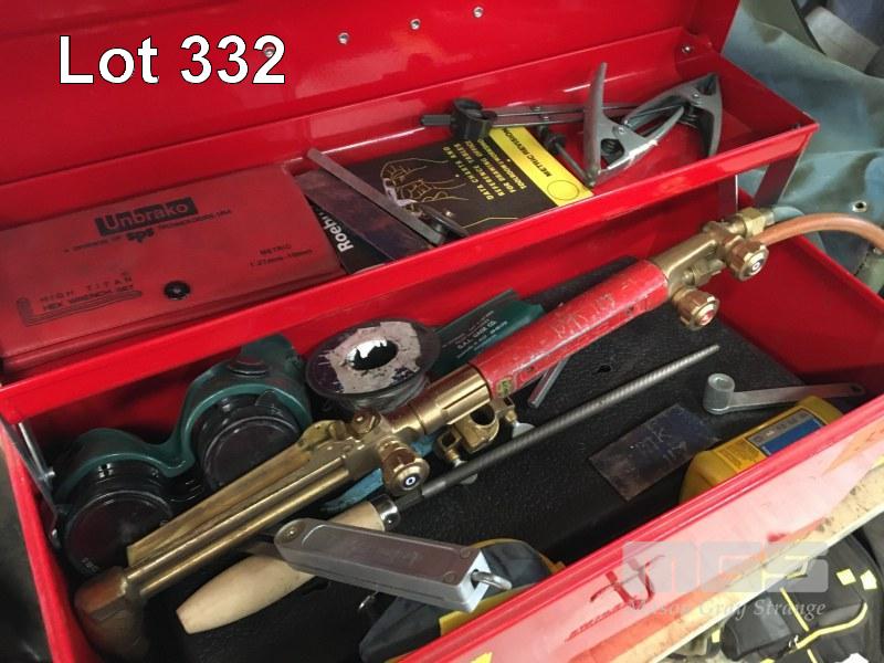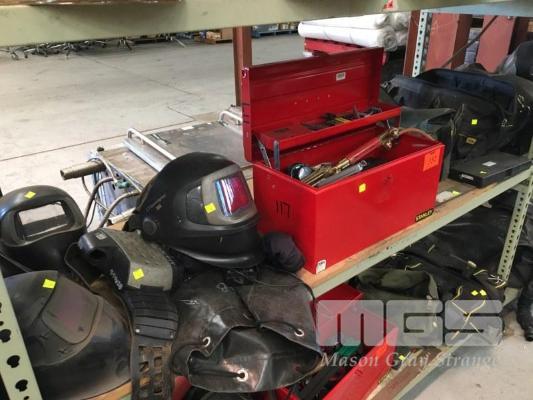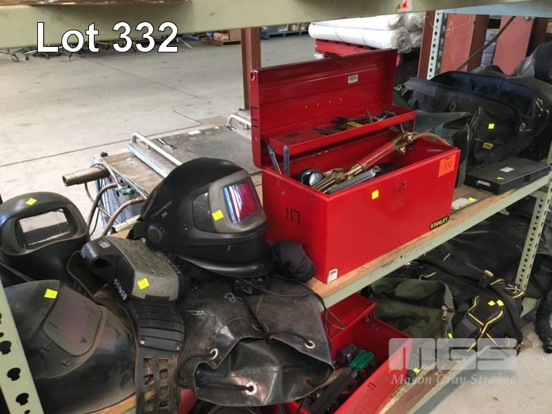STANLEY TOOL BOX & CONTENTS INC SCREWDRIVER SET, CUTTING TORCH, PRECISION COMBINATION SET, ETC, STANLEY TOOL BAG WITH VICE GRIPS & SPEEDGLAS POSITIVE FEED WEDLING UNIT, BATTERY & CHARGER, 1 x SHELF