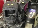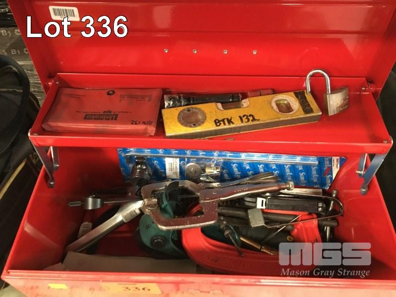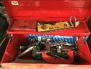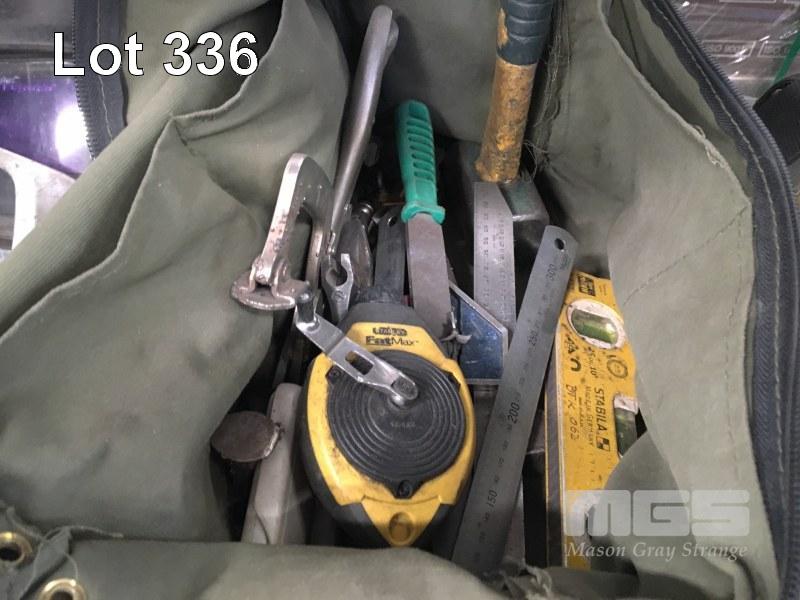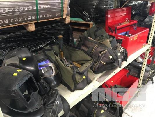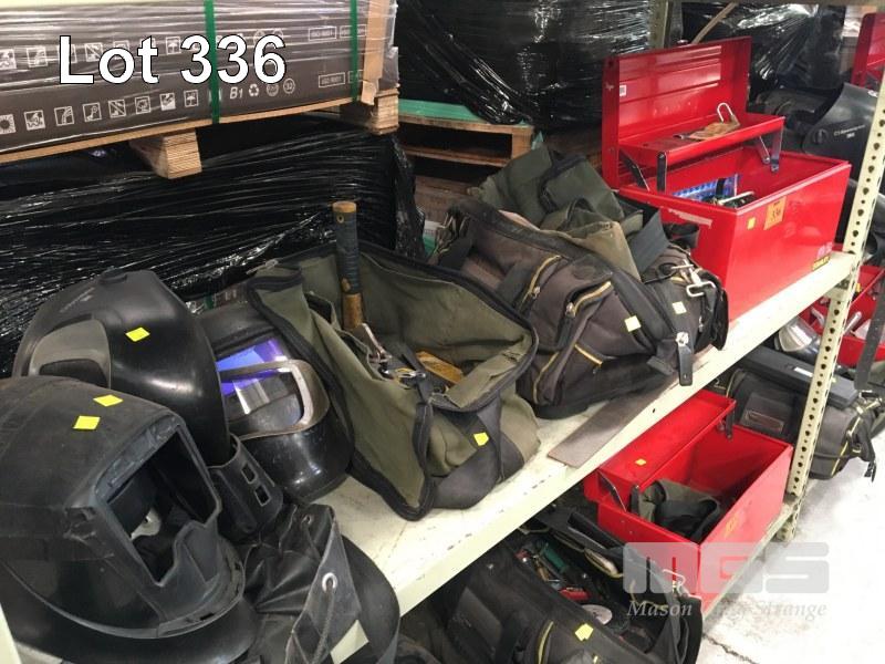 3 x STANLEY TOOL BAGS & BOX INC, VICE GRIPS, LEVELS, ROLLER & RADIUS GUIDE ETC INC WELDING HELMET & POSITIVE FEED WELDING KIT, DAMAGED, NO BATTERY OR CHARGER, 1 x SHELF