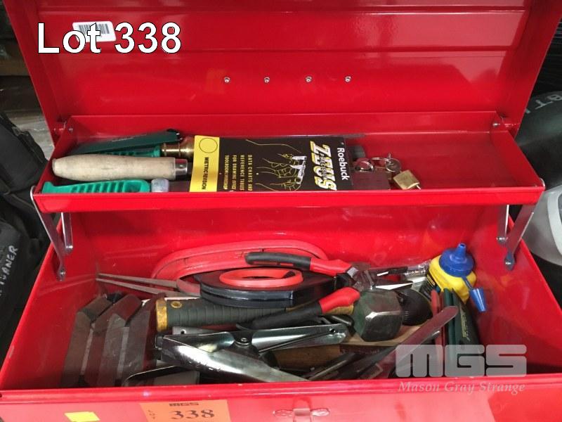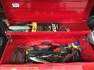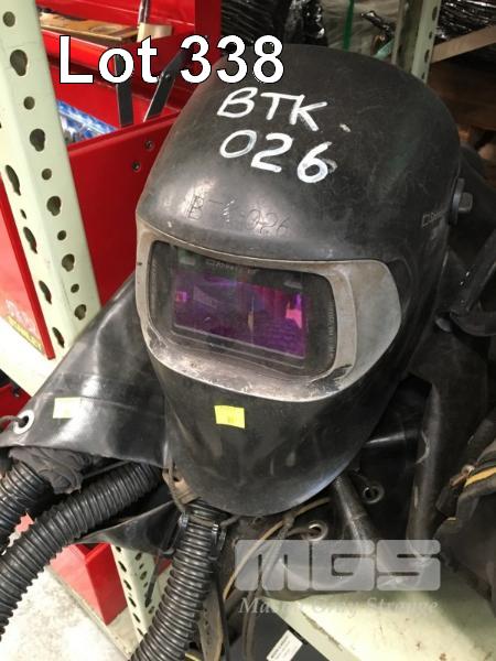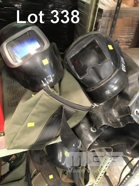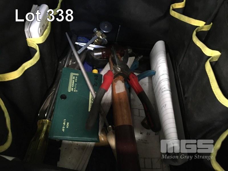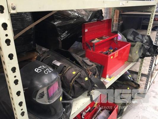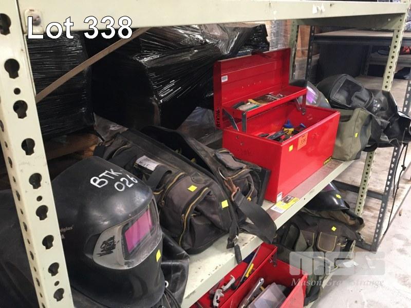 3 x STANLEY TOOL BAGS & BOX INC, HEX WRENCH SET, CLAMPS, SIDCHROME PLIERS, 2 x POSITIVE FEED WELDING KITS, 2 x BATTERIES & 1 x CHARGER 1 x SHELF (HELMET DAMAGED)