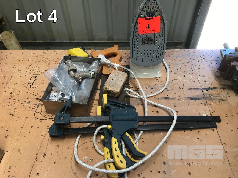 PAIR VICE GRIPS, IRON, HANDSAW & CONSUMABLES