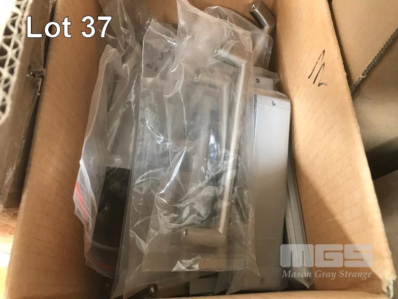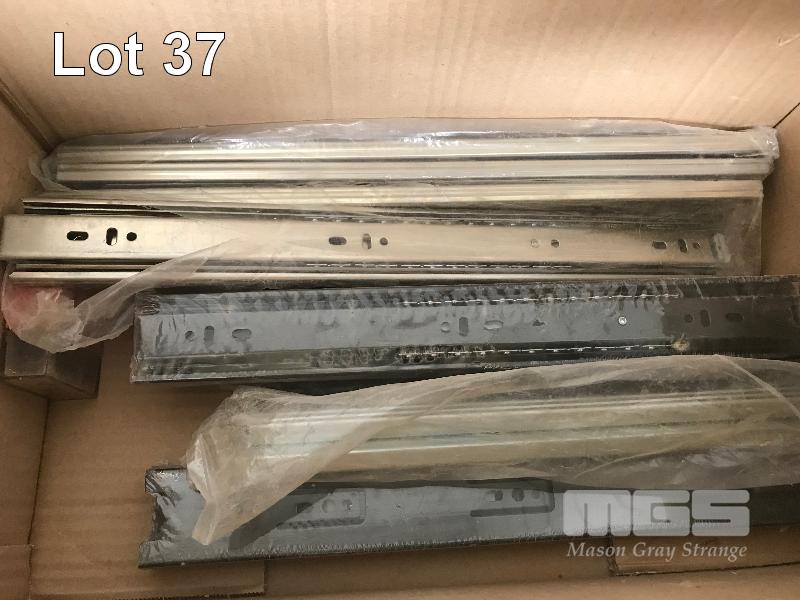 ASSORTED FURNITURE, HARDWARE & FASTENERS, DRAWER RUNNERS, HINGES, HANDLES, BOOKCASE SHELF, PLUGS, FLATHEAD SCREWS ETC (5 x BOXES)
