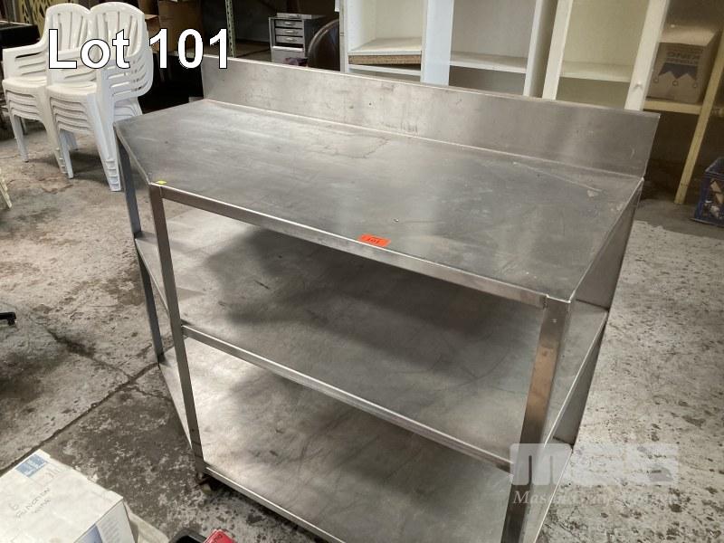MOBILE STAINLESS STEEL, IRREGULAR SHAPE BENCH, 3 TIER WTIH SPLASHBACK