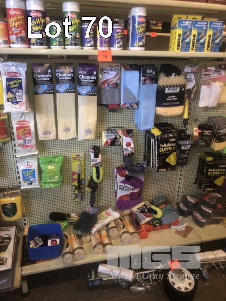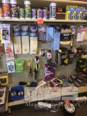 CONTENTS SHELF/BAY. CAR DASH WIPES, SCREEN, SANITISERS, ORIGINAL CHAMOIS, MICRO FIBRE CLEANERS, POLISH CLOTHS, ETC