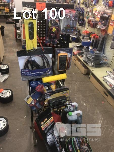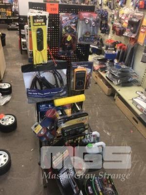 MIX COMBOLOT & STAND INC 400AMP JUMPER LEADS, DIGITAL MULTIMETER, AIR PUMP, COOLANT, BATTERY CHARGER, 6/12V, FUEL CANS, ETC