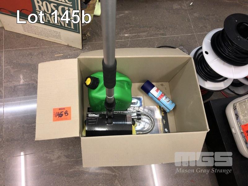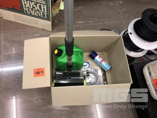 5L GREEN PLASTIC FUEL CAN, ANTI CORROSION LUBRICANT, HOSE ATTACHMENT BRUSH, TYRE INFLATOR