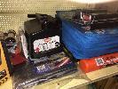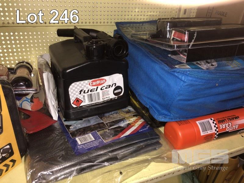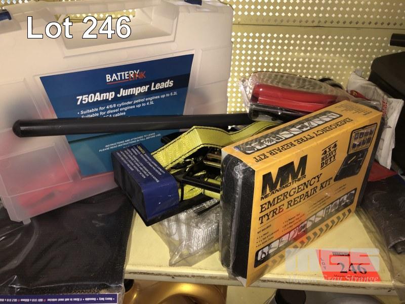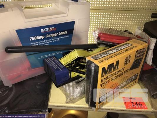 TRAVEL PACK, INC BOOSTER LEADS, 750AMP, TOW STRAP, CHARGER, FUEL CAN, TIE DOWNS, WHEEL COVER, REPAIR KIT, MULTIMETER, CHAMOIS, CARGO NET, ETC, 1 x SHELF