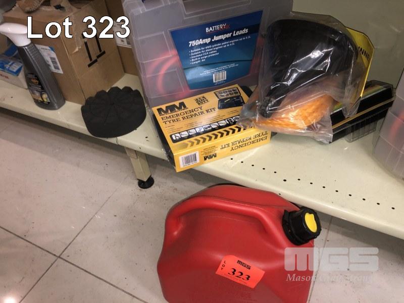 CAR KIT, 750AMP JUMPER LEADS, BATTERY CHARGER, TOW ROPE, FUNNEL & TYRE REPAIR KIT WITH FUEL CAN