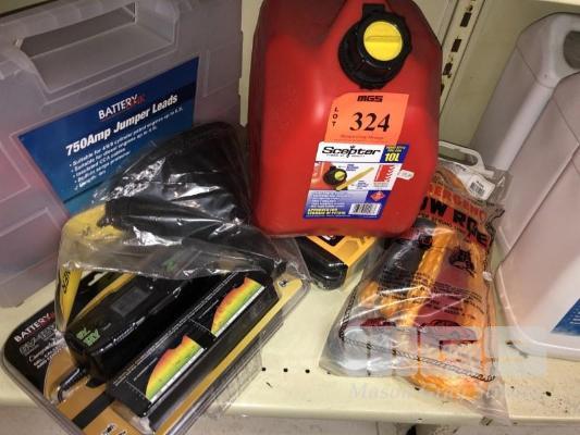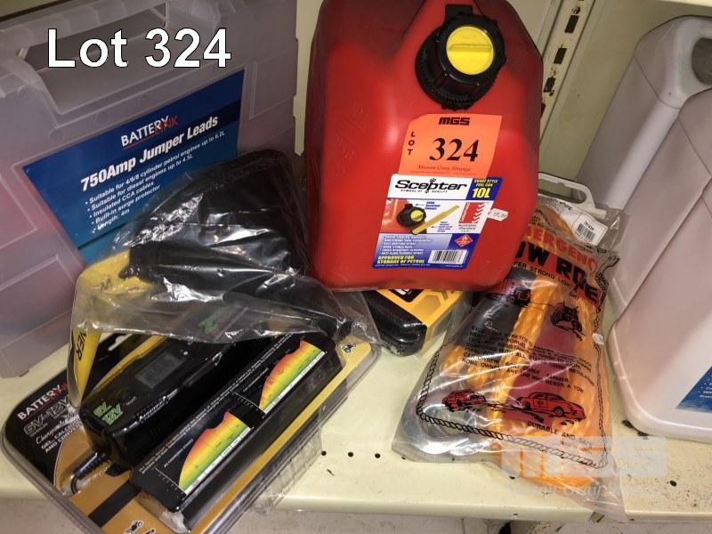 CAR KIT, 750AMP JUMPER LEADS, BATTERY CHARGER, TOW ROPE, FUNNEL & TYRE REPAIR KIT WITH FUEL CAN