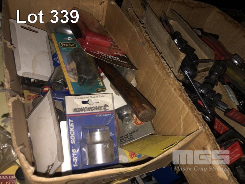 ASSORTED TOOLS, PART SHELF, SOCKET SETS, PULLER, DRIVERS, LRG SOCKETS & MORE