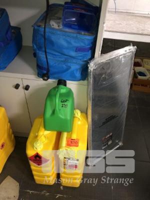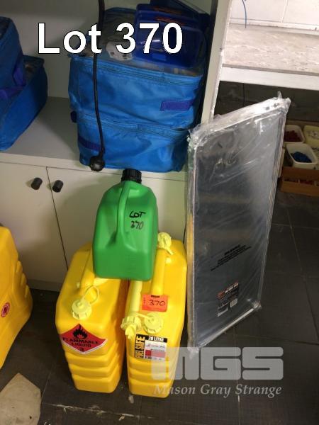 2 x 20L YELLOW JERRY CANS, PLASTIC, 1 x 5L GREEN JERRY CAN, PLASTIC, 2 x CAR COVERS, 3 x FUNNELS, 5 x GALV DRIP TRAYS