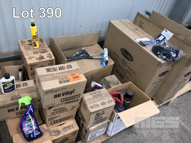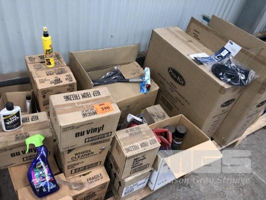 CONTENTS OF 2 PALLETS, MEGUIARS WAXING PASTE, NU VINYL PRODUCTS, STP INTERIOR PROTECTOR, SQUEEGEES, WHEEL CLEANER ETC.