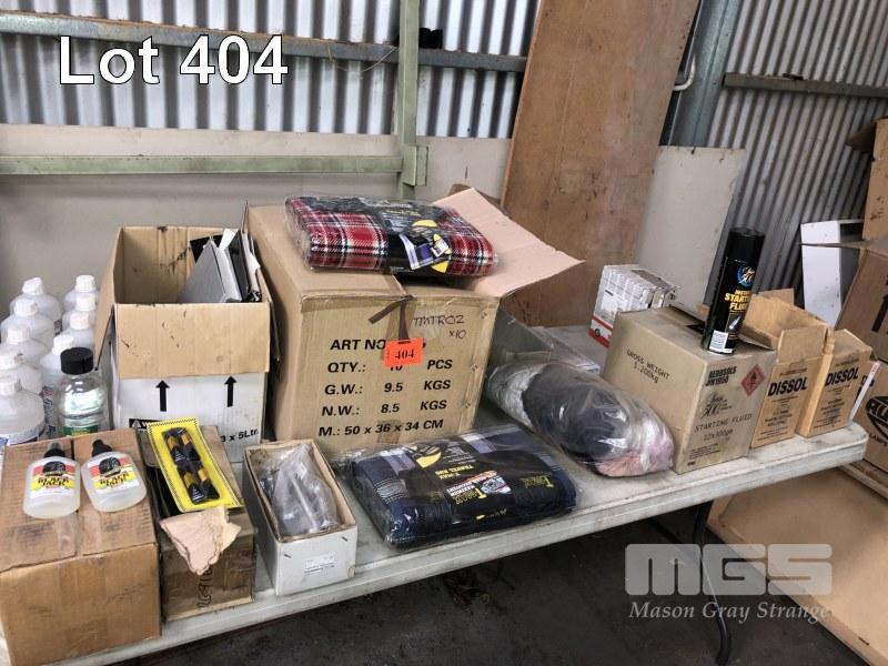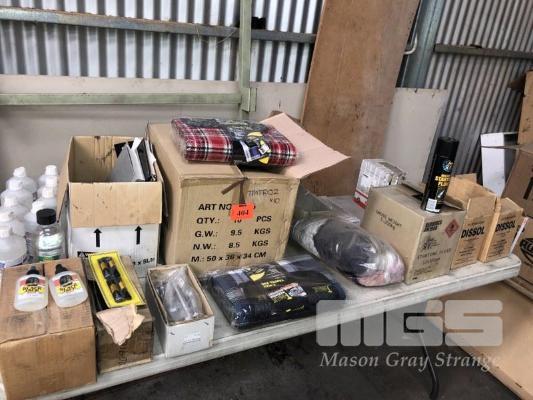 10 x T-MATS TRAVEL RUGS, CARTON INSTANT STARTED FLUID, 2 x CARTONS VINYL CLEANER, 9 x BOTTLES AIRCON CLEANER, 1 CARTON BLACK JACK TIRE SHINE, REFLECTORS, GEAR PULLER, DISPOSABLE GLOVES ETC.