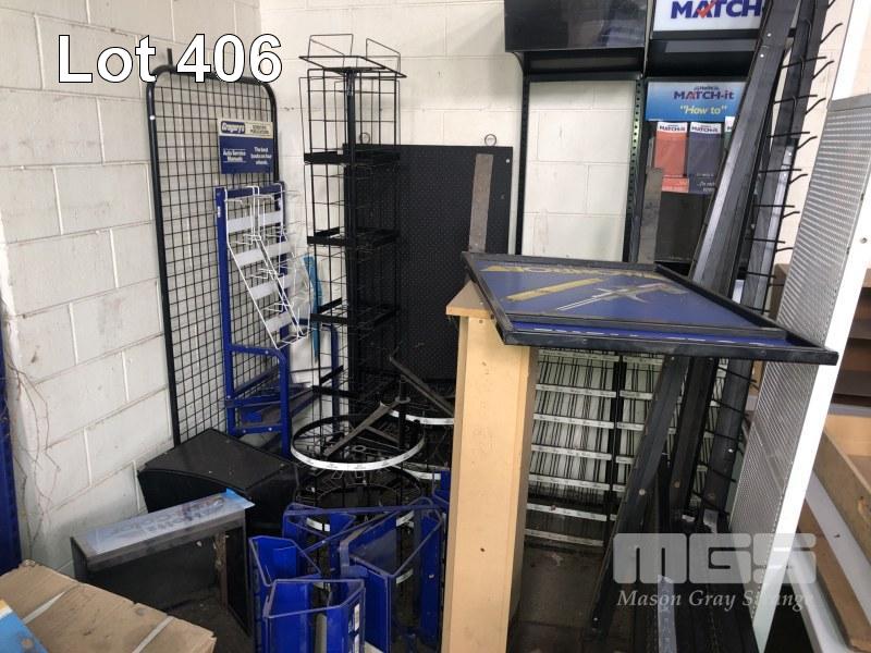 ASSORTED SHOP DISPLAY RACKS & RANDLES, DISPLAY SIGNS, PLASTIC PARTS, SHELVES & DESK