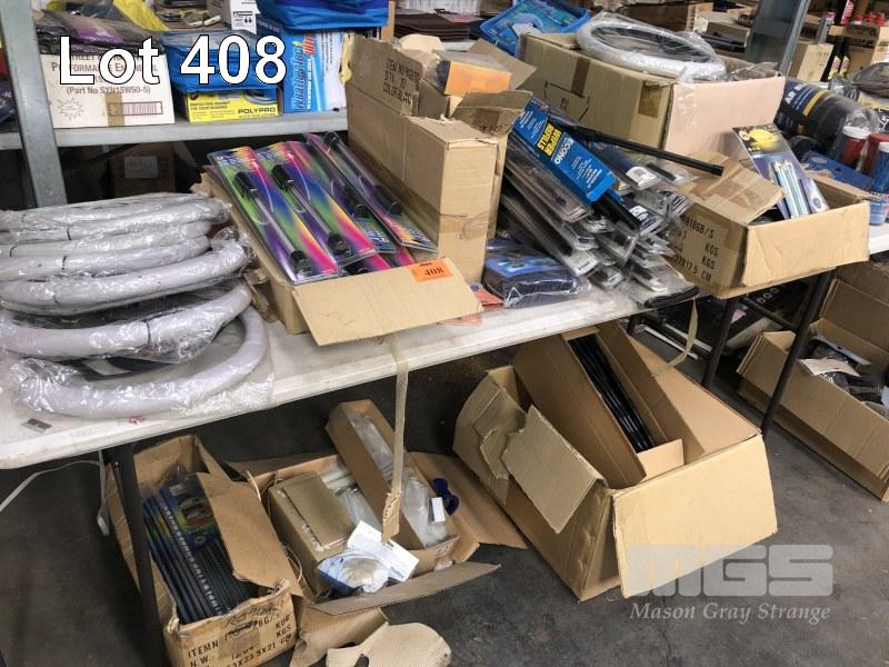 CONTENTS OF TABLE, MIRROR PROTECTORS, STEERING WHEEL COVERS, NEON LIGHTS, WIPER BLADES, 36 x PLASTIC FUNNELS ETC.