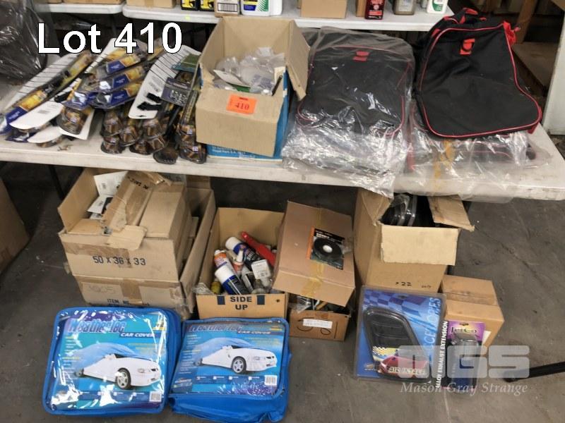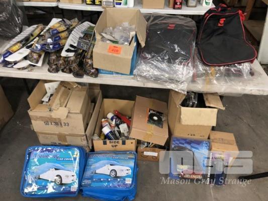 CONTENTS OF TABLE, DUFFLE BAGS, CAR COVERS, WINDSCREEN WIPER BLADES, 12v BATTERY GUARD, DOUBLE SIDED TAPE, EASY SHINE, AIR INTAKES, EXHAUST TIPS ETC.