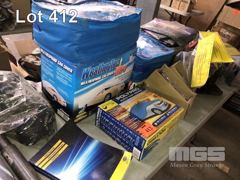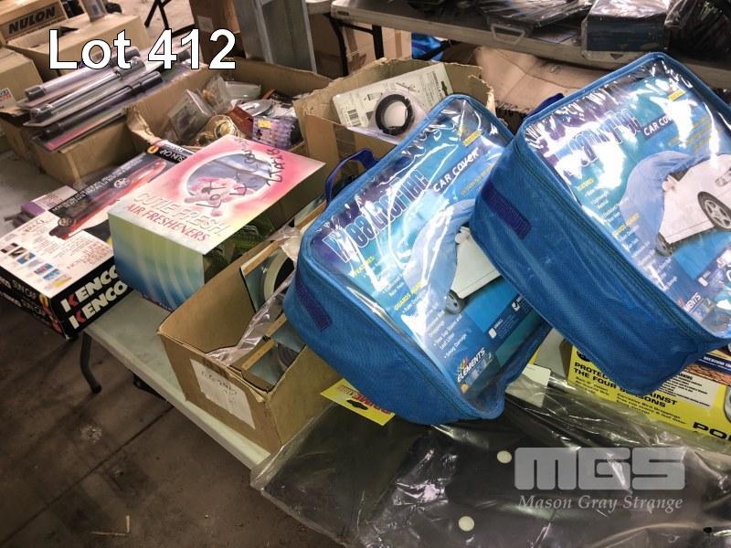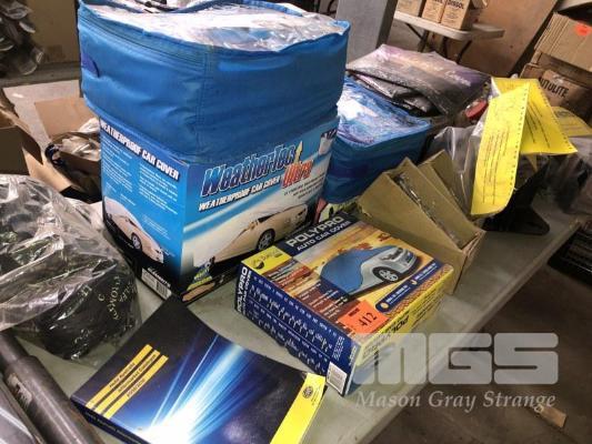 CONTENTS OF 2 TABLES, CAR COVERS, REFLECTORS, WHEEL STOPS, DOUBLE SIDED TAPES, SHIFTER KNOBS, SUN COVERS, NEON LIGHTS ETC.