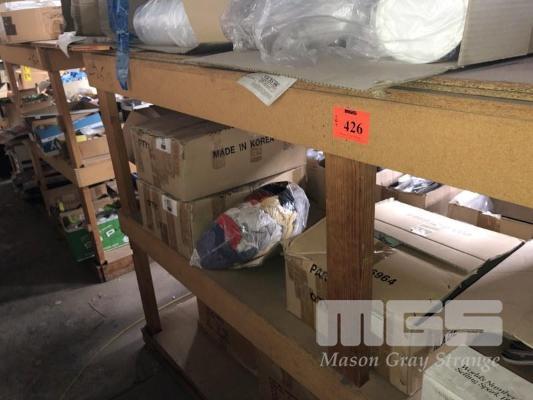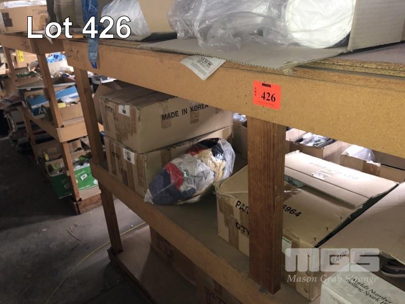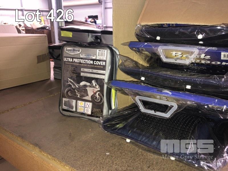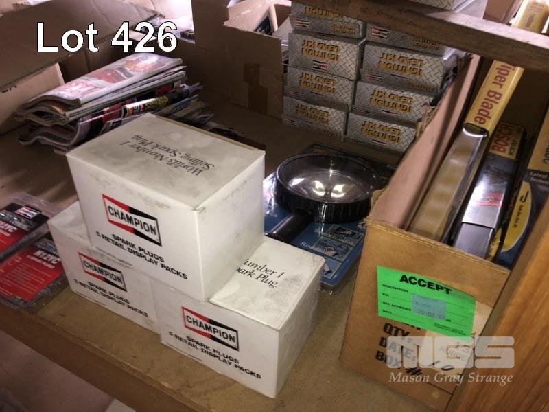 CONTENTS OF RACK, MOTOR CYCLE COVERS, CHAMPION SPARK PLUGS, RAG BAGS, BUCKETS, WIPER BLADES, PLUG LEAD KITS, BATTERY TERMINALS, BATTERY CLAMPS