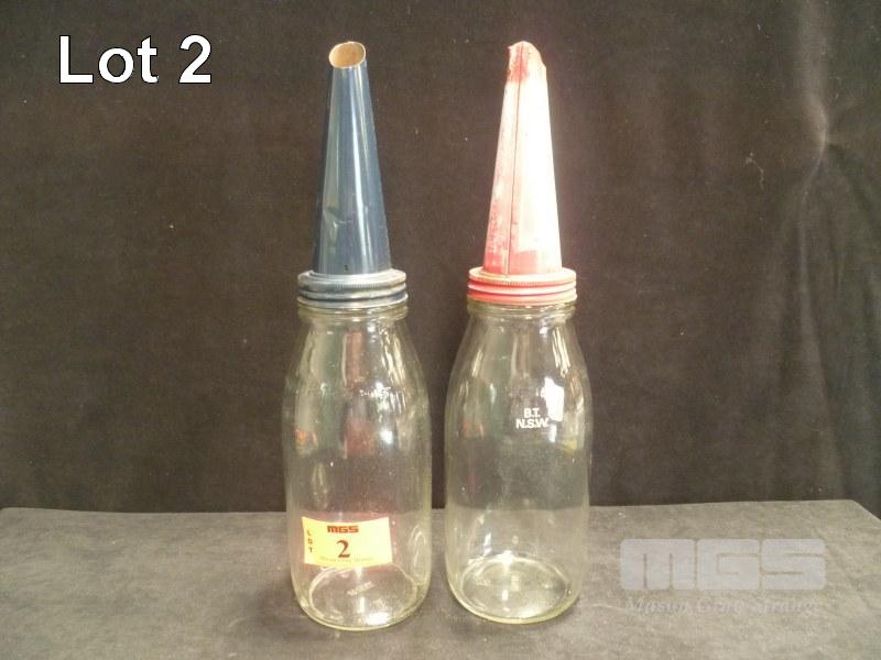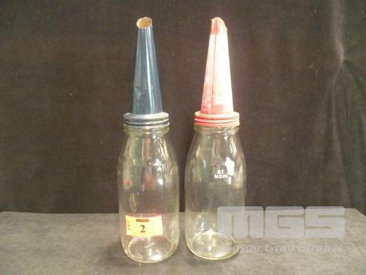 2 x GLASS QUART OIL BOTTLES WITH TIN TOPS