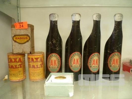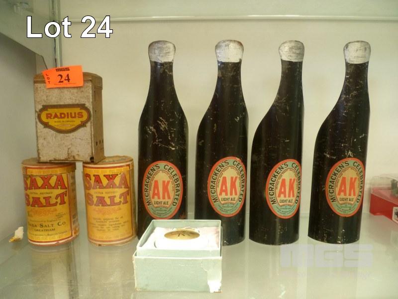 4 X AK LIGHT ALE TIN STANDS, 2 X SAXA SALT CONTAINERS, RADIUS TIN & SUNBEAM SHAVER