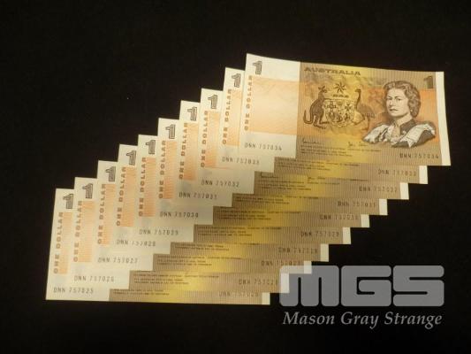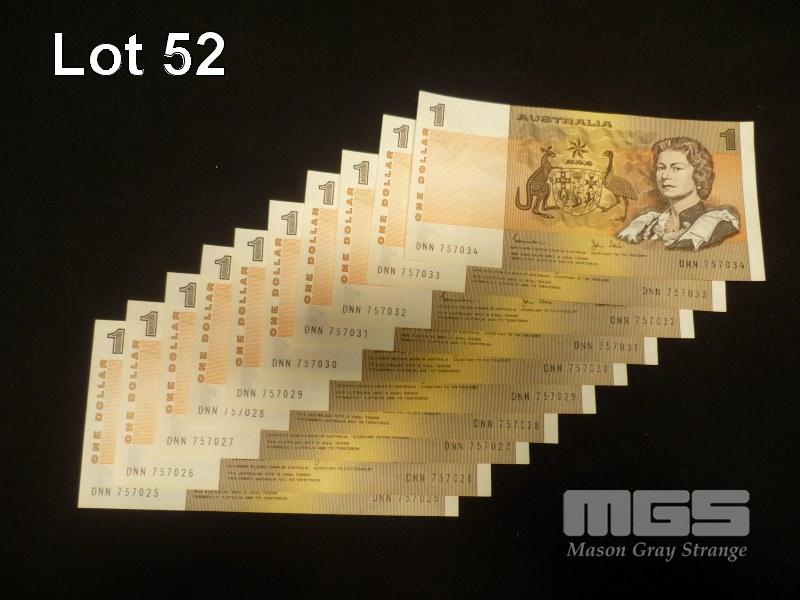 10 X 1982, AUSTRALIA CONSECUTIVE, $1 BANKNOTES, JOHNSTON/STONE, UNC, DNN 757025-034