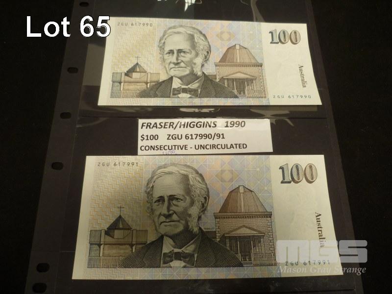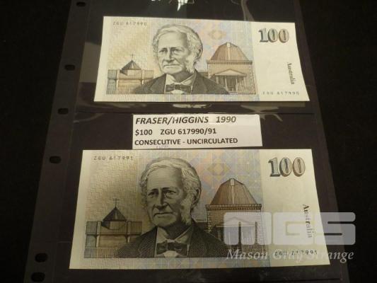 2 X 1990, AUSTRALIA, CONSECUTIVE, $100 PAPER BANKNOTES, FRASER/HIGGINS, ZGU 617990-991 (UNC)