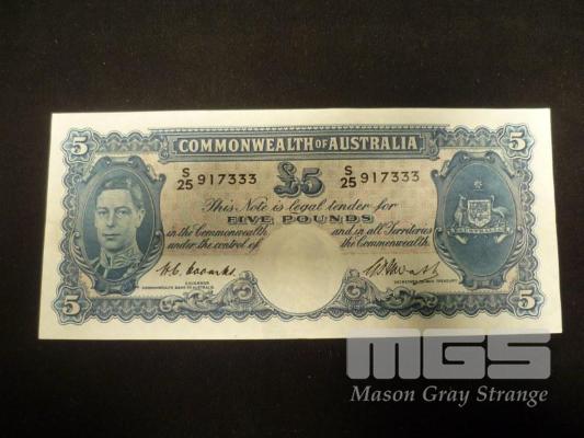 1949, COMMONWEALTH OF AUSTRALIA, 5 POUND BANKNOTE, COOMBS/WATTS, S25 917333 (UNC)