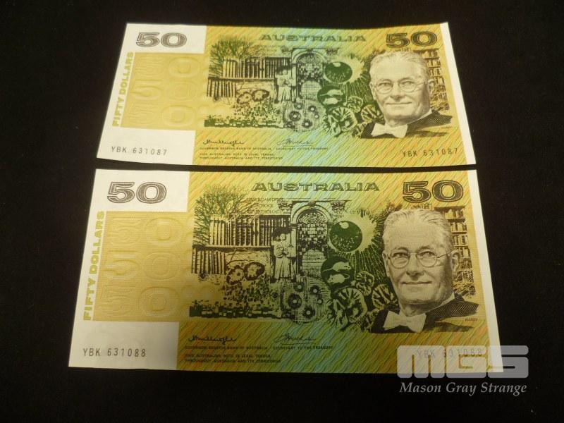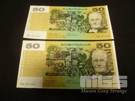 2 X 1976 AUSTRALIA, CONSECUTIVE, GOTHIC, $50 PAPER BANKNOTES, CENTRE THREAD, KNIGHTS/WHEELER, YBK 631087-088