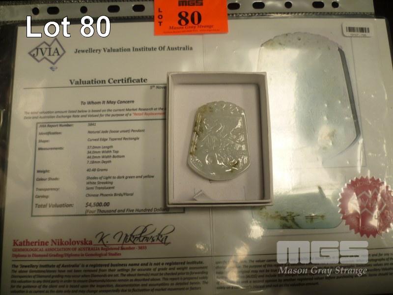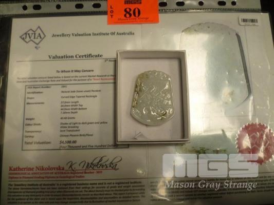 NATURAL JADE PENDANT (LOOSE UNSET), CHINESE PHOENIX BIRDS/FLORAL, SEMI TRANSLUCENT, SHADES OF LIGHT TO DARK GREEN AND YELLOW WHITE STREAKING, 40.48 grams, WITH VALUATION CERTIFICATE OF $4,500