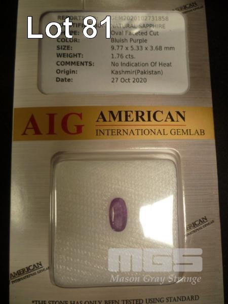 BLUISH PURPLE NATURAL SAPPHIRE, OVAL, 1.76ct, ORIGIN: KASHMIR REPLACEMENT VALUATION CERTIFICATE $3,290 AIG Report: GEM2020102731858