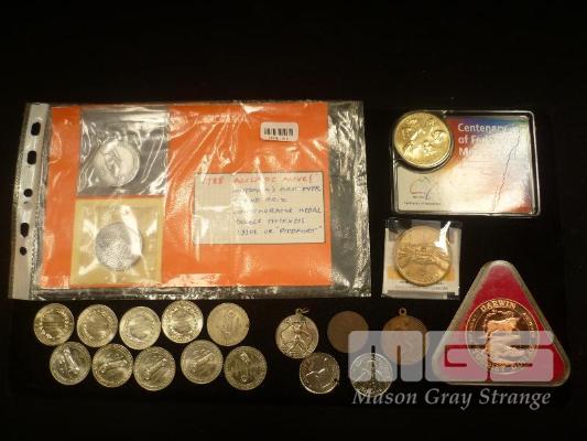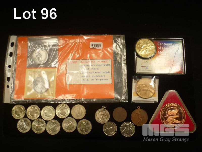 2 X 1988 ADELAIDE GRAND PRIX MEDALS, 10 X 1990 ADELAIDE GRAND PRIX TOKENS & ASSORTED AUSTRALIA COMMEMORATIVE MEDALLIONS, TOKENS, ETC
