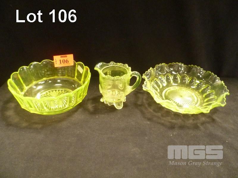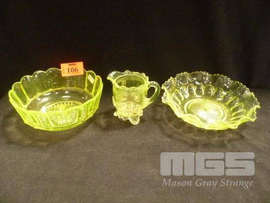 2 x URANIUM GLASS BOWLS & PITCHER (PITCHER HAS CHIP ON RIM)