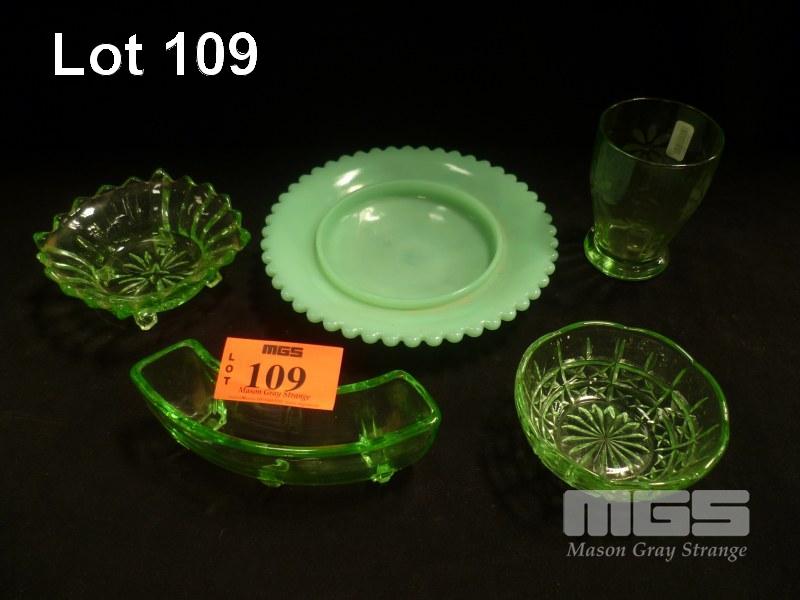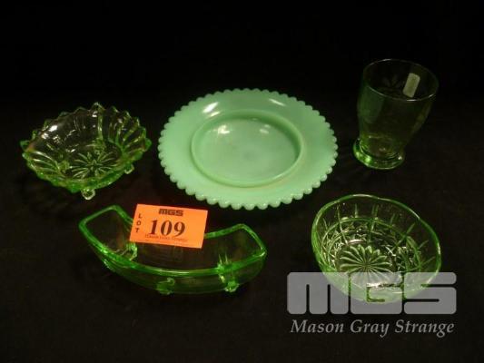 5 x PIECES URANIUM GLASS INC FROG SECTION, 2 x SMALL BOWLS, GLASS & MILK GLASS BASE