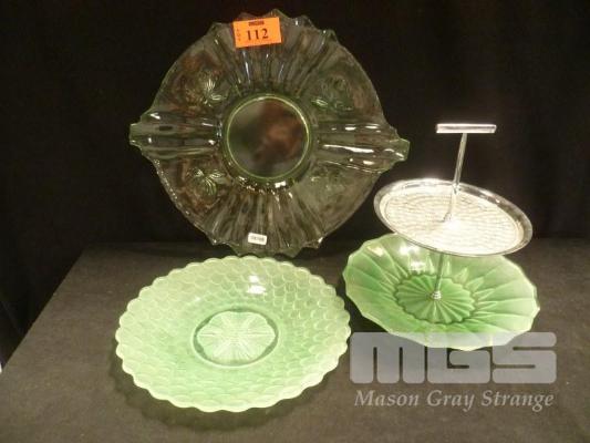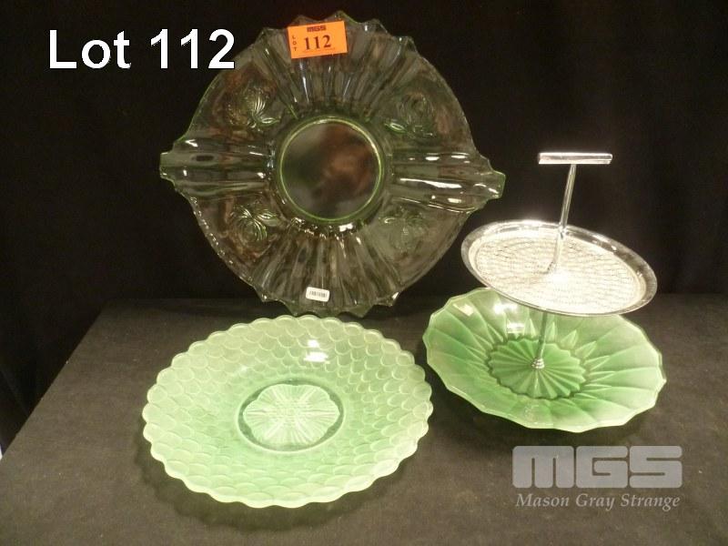 2 x URANIUM GLASS PLATTERS, 23, 25 & 37cm DIAMETER
